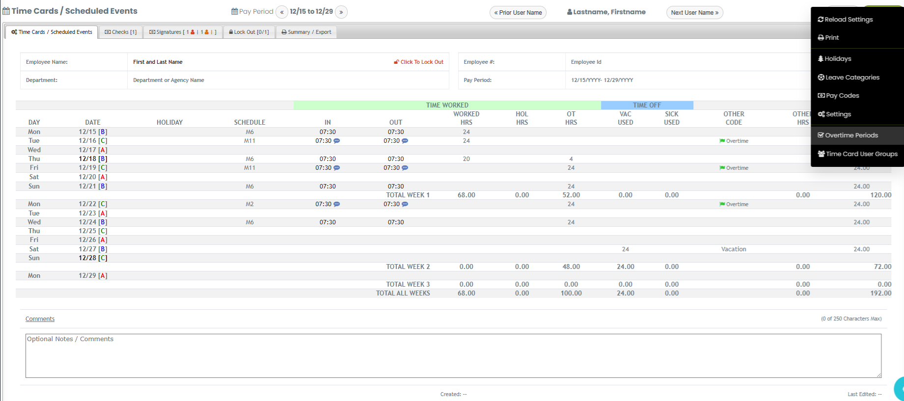 We have just completed a full re-write of the payroll system to allow for much faster calculations and standardization of our coding. This allows us to quickly add any custom exports, rules, and customization that organizations frequently need. Additionally, we can more easily integrate with many more payroll systems. We have also added lock outs for individual users/groups, editing of events from the time cards, improved printing, print headers/footers, and several tools to speed up the payroll verifications. If your agency needs any custom rules, validations, exports, or changes, we are glad to assist with any of those too! Keep reading for an overview of many of the payroll features and concepts.