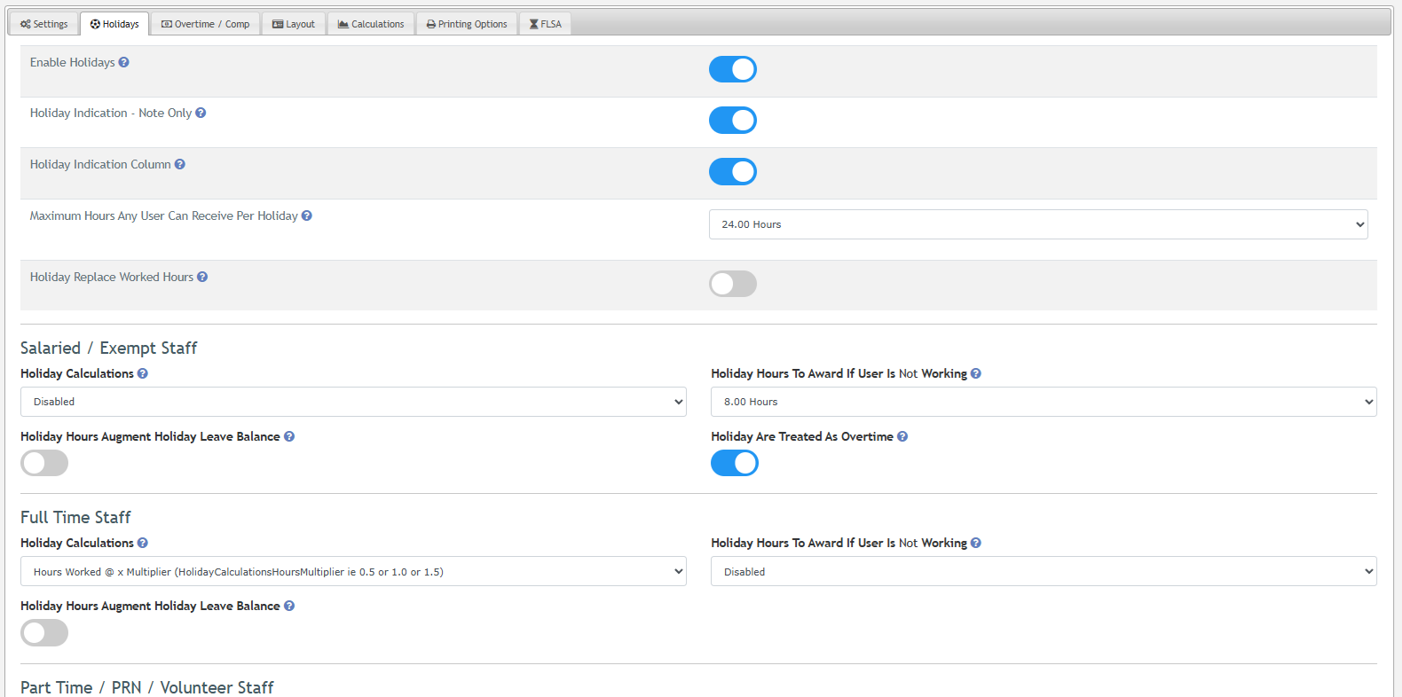 There can be multiple holiday codes for varying levels of staff in situations. The holiday calculations are broken down by salaried full time and part time staff. This will let the system know that this should be a fractional amount such as hour for hour or other options such as a specific amount regardless of the amount of time they are working. Use the holiday hours to award if user is not working to set a specific amount to award when no hours physically worked or leave categories that are enabled as worked hours. Use the settings to augment the leave balance which will award the users hours into their available time off banks when a holiday occurs.