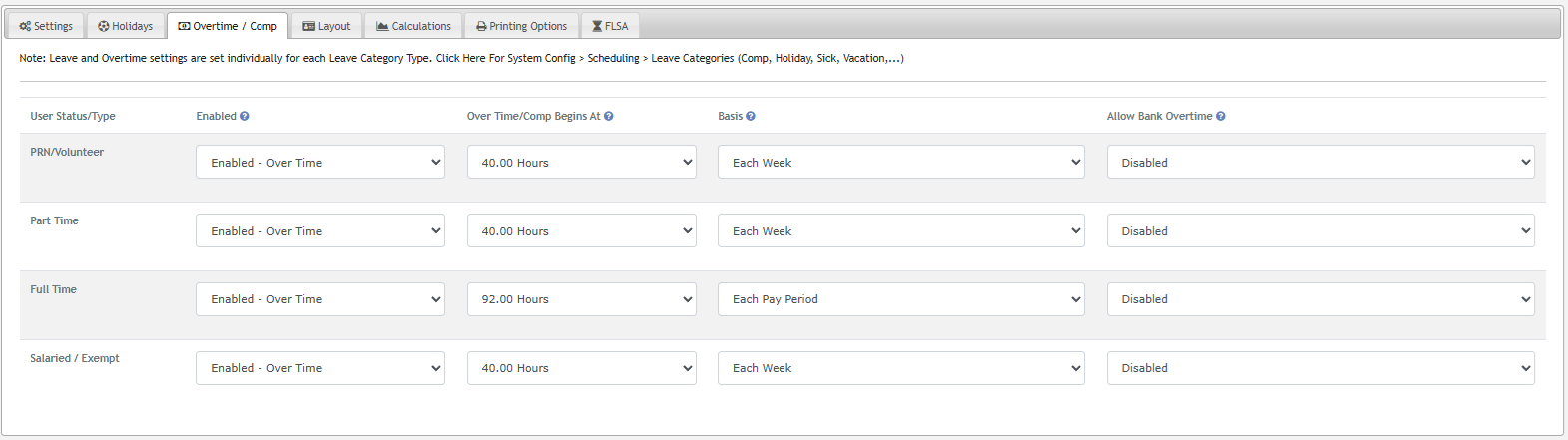 There are many different ways to calculate overtime for individuals. Rules can be based upon the user status such as part time full time and salaried. For customizations on a user level there are additional options as well. Users can be assigned to an overtime group which has rules that will supersede the status rules. Furthermore you can customize the overtime amounts on a individual user level by clicking on the users profile then Employment tab > Miscellaneous > Override OT/Comp Settings. Overtime can be calculated weekly, by pay period, and monthly. Additionally, the overtime periods allow for further customization such groups of people having their pay week start on different days of the week. FLSA rules can also be utilized as well. In the case of a 14 day pay period with a 28 day cycle, we can “look back” at the prior pay period and carry those hours into the OT amounts.