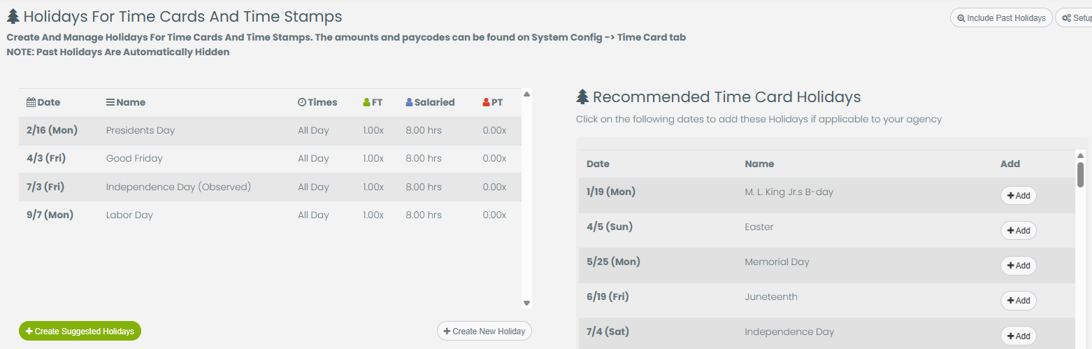 In the situation above these holidays have been defined as an all day event operating from midnight to midnight. You can also customize the times such as 7:00 AM in the morning until 7:00 AM the following day. Full time staff are set up on a multiplier awarding one hour for every hour worked while salaried staff receive a blanket 8 hours per holiday. This can be customized between holidays and extend to part time staff if needed. Click the create suggested holidays to open the typical holidays utilized. You can always add additional holidays with the Create new Holiday button.
