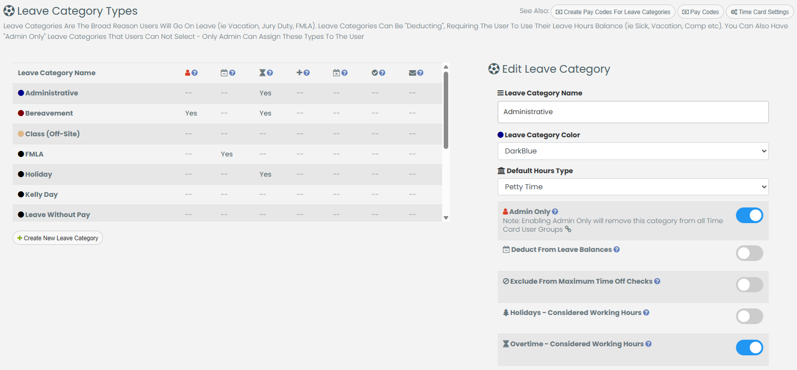 Use the “Leave Categories” quick link in the top right of the time card page or System Config > Scheduling > Leave Categories.